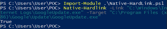 Next we need to create a hard link from C:\Windows\Internet Logs to the Google Update executable. FuzzySecurity's PowerShell-Suite has a handy PowerShell script for creating hard links using NtSetInformationFile directly; Native-HardLink. We import that script and create a hard link to the Google Update executable.