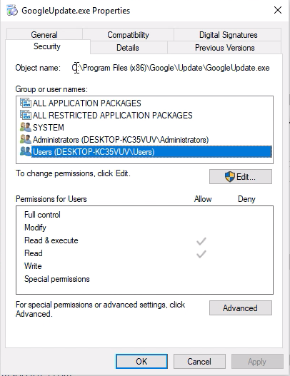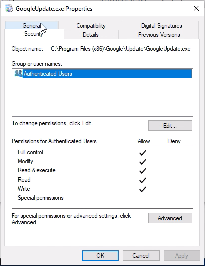 Next, because standard user accounts cannot restart the Check Point services, we reboot the computer to induce a restart of the services. When booted up, we'll see that the file permissions for GoogleUpdate.exe has updated and we can now overwrite its contents as a standard user.